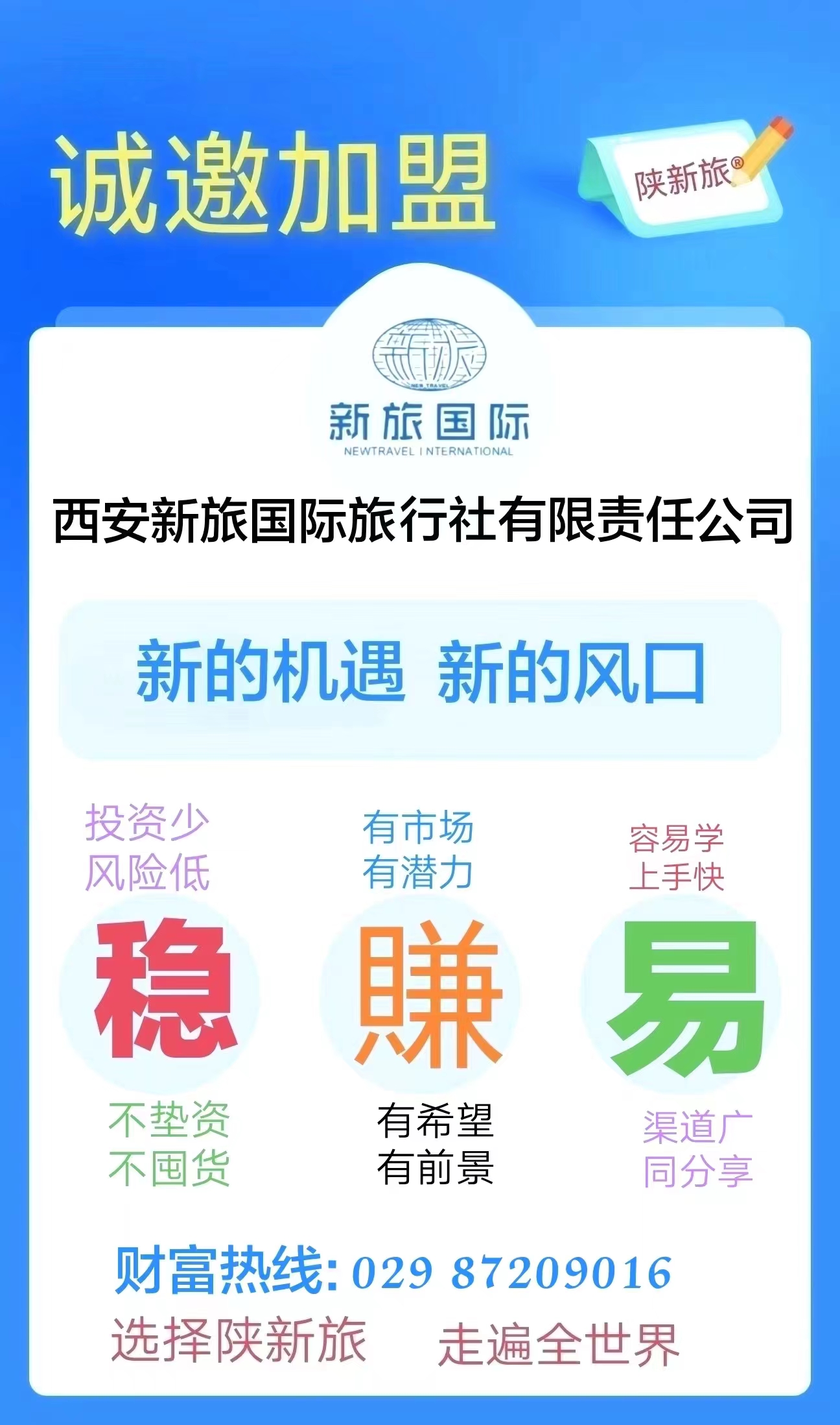 歡迎各地的有識之士能加盟到我們團隊中來,資源共享、共謀發展!為旅行創造精彩,讓游客感動生活;選擇陜新旅,走遍全世界!