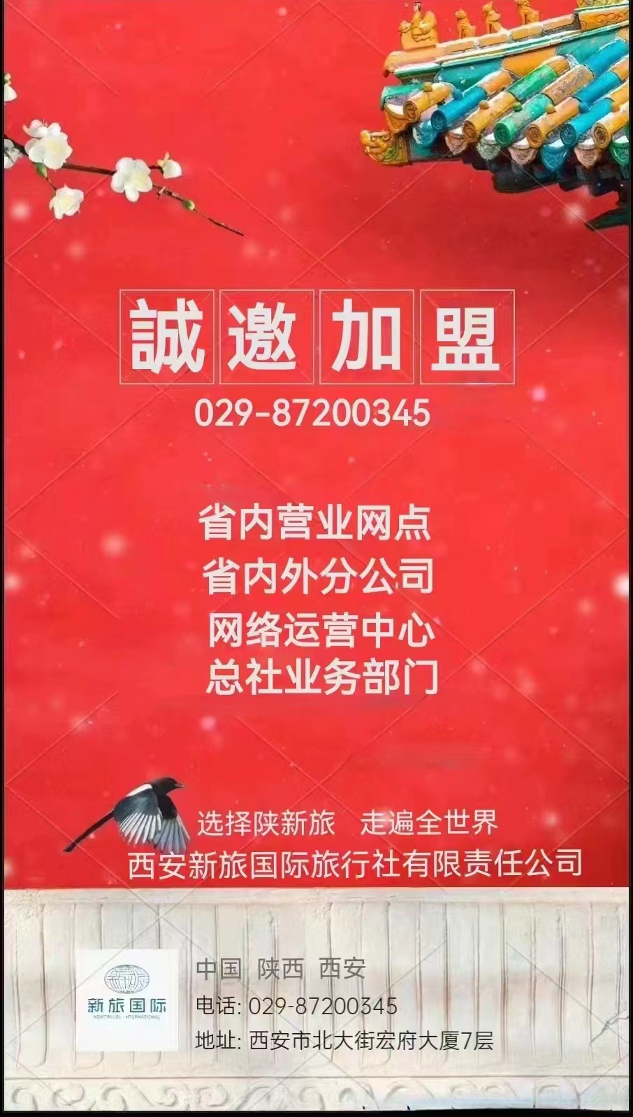 因企業規模擴大、市場發展需求,現面向全國誠邀分支機構加盟!誠邀分公司加盟、營業網點加盟、同業批發專線部門加盟、戶外游項目加盟、自駕游俱樂部加盟、網絡中心加盟、票務中心加盟。每縣限門市和分公司各一家,歡迎來電029-8720 0345;029-8720 0337;029-8720 9016;029-8720 9549垂詢!