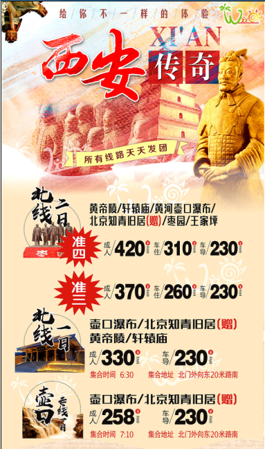 您好,歡迎瀏覽我社國內游 周邊游 西安周邊游推薦 濱海度假、草原休閑、山岳探險、鄉村民俗、紅色旅游線路等相關旅游線路,網上報價僅做參考,詳情請來電咨詢029-8720 0345;029-8720 0337;029-8720 9016;029-8720 9549咨詢!謝謝!