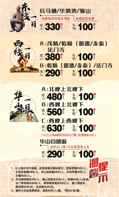 2、當地天氣:西安及周邊地區平均氣溫:春秋季15-25℃、夏季25-35℃、冬季-5-10℃(早晚溫差較大),請游客出行前關注天氣預報。全年平均濕度40-60%(偏干燥),旅游途中多補充水分。